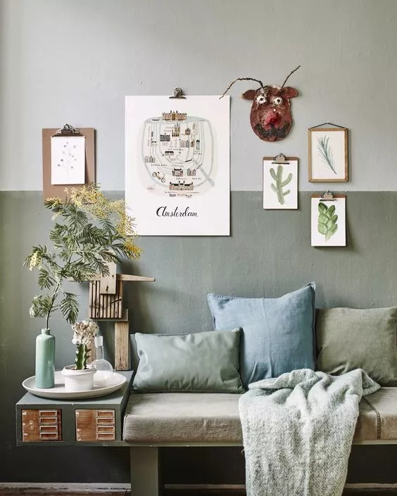 怎么做到的呢?比如下面這張圖中,鼠尾草綠灰的墻面好像變成了沙發(fā)的靠背,同時(shí)又如空間的畫框一般把人的目光吸引過來。