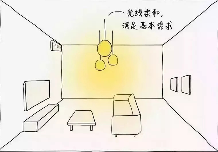 但由于這兩者存在明顯的照明界限。而且都是集中光源,不易調(diào)節(jié)。所以建議大家可以采用點(diǎn)狀光源,均勻分布于天花板,按需求調(diào)節(jié)亮度,節(jié)省用電。也可以選用造型感強(qiáng)的漫射照明燈具,以滿足核心區(qū)域的照明需求▼