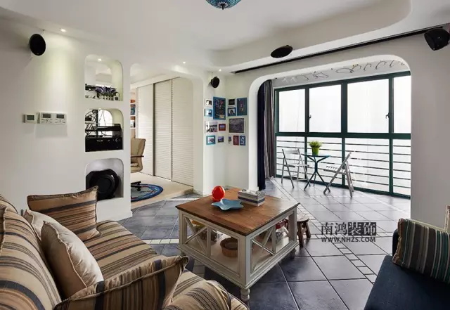 地中海風(fēng)格中的茶幾,和木紋飾面的沙發(fā)相映成趣,中空處擺上盆栽,仿佛成了一個(gè)小展館。