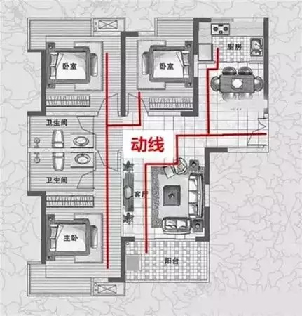??動線就是指人們活動的路線,它根據(jù)人的行為方式把一定的空間組織起來。換句話說,就是人在室內(nèi)室外的移動點,聯(lián)合起來就成為了動線。動線設(shè)計一般由兩部分構(gòu)成,一是固定物件的擺設(shè),二是人流、物流的路徑。戶型動線一般分為三類:家人動線、家務(wù)動線和訪客動線。三種動線在涉及區(qū)域和設(shè)計要點方面都有所不同。