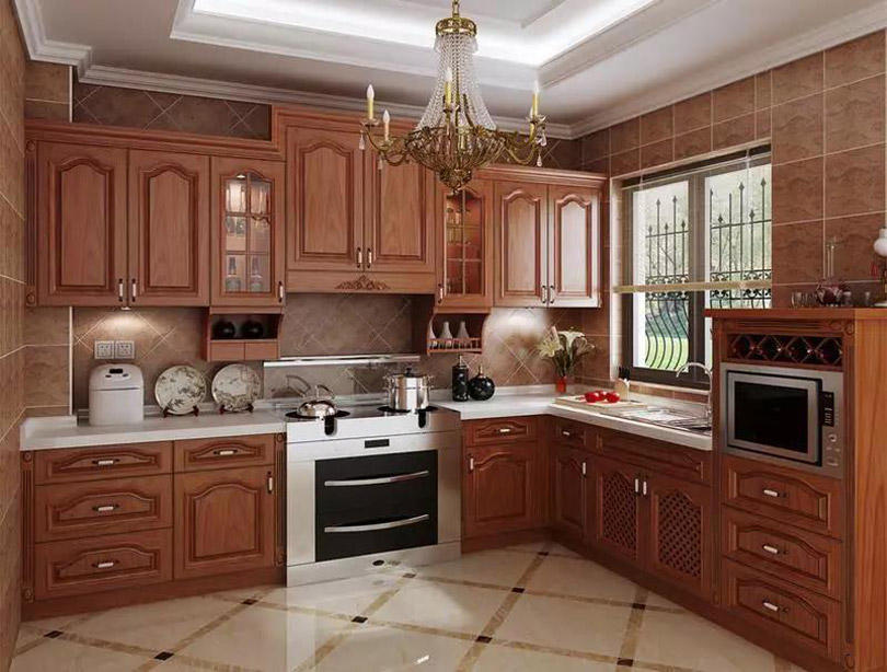使用實(shí)木制作櫥柜門(mén)板,風(fēng)格多為古典型,美式、中式家居風(fēng)格中比較常見(jiàn),以櫻桃木色、胡桃木色、橡木色為主。