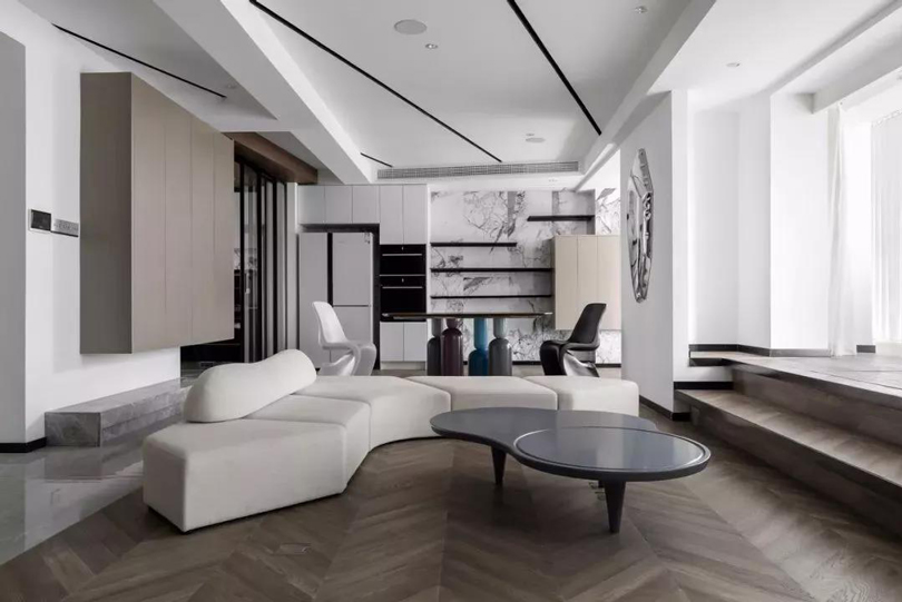 如果嫌太冷淡,可以在周邊的軟裝配飾上增添亮色系點綴,比如抱枕、茶幾、吊燈等。