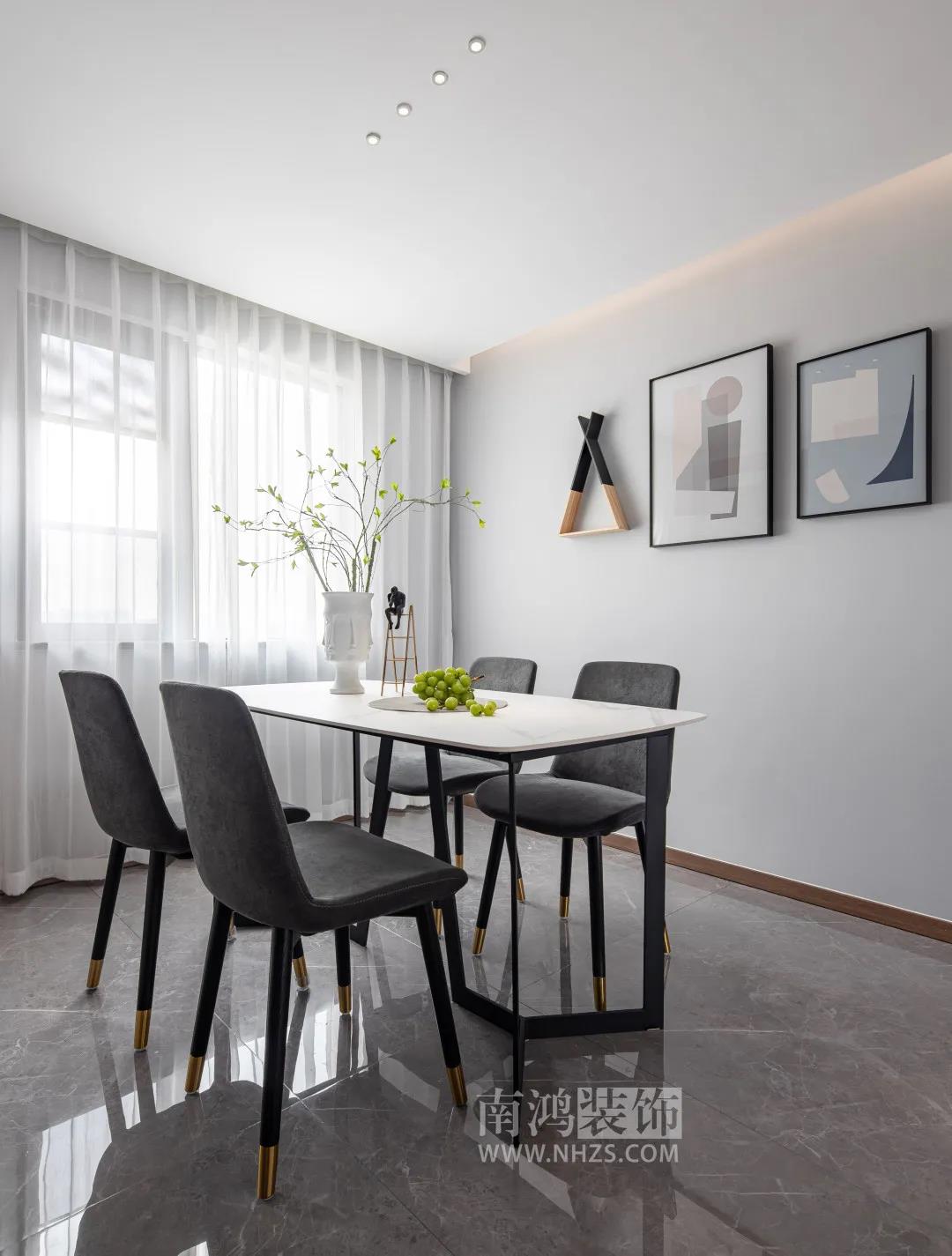 地址 / 締壹城 戶型 / 四室兩廳 面積 / 135㎡ 風格 / 現(xiàn)代風格 設(shè)計施工 / 浙江南鴻裝飾 本案為寧波締壹城現(xiàn)代風格作品。業(yè)主是一對年輕夫妻,家里有一雙尚年幼的兒女,他們希望這個新家能融合許多時尚前衛(wèi)的小細節(jié)。 本案的材質(zhì)選用有大理石磚、木飾面、不銹鋼條、硅藻泥等,配以大量輔助光源來打造業(yè)主的理想居所。 戶 型 圖 客 廳 Living Room 客廳足夠簡潔敞亮,陽臺被包進來做抬高處理,成為一處不錯的休閑場所。家具挑選得都較為低矮,無形中拉伸了層高,也讓空間更為通透。 電視背景墻選用爵士白大板磚背景結(jié)合金色不銹鋼打造的開放柜,個性突出,木質(zhì)的地柜與木格柵元素摻雜進溫潤的視感,平衡了冷暖溫度。 三幅組合裝飾畫懸掛于沙發(fā)背景墻,干凈明晰,不著多余的色彩,挺拔的綠植安靜地立于一側(cè),默默為空間注入清新之感,灰色主沙發(fā)完美契合基調(diào)。 客廳望向餐廳。頂部是無主燈設(shè)計,燈光也要貼合現(xiàn)代風格的簡潔特征。 餐 廳 Dining Room 餐廳,纖薄的石材桌面搭配簡約風的灰色餐椅,桌椅低調(diào)至簡,再配上白紗簾,頗有清風徐來的唯美之意。 廚 房 Kitchen 廚房面積雖有限,使用起來可一點兒不會拘束,L型的結(jié)構(gòu)最大化利用了空間又讓動線足夠流暢。深灰的櫥柜搭配黑色拉手,簡潔又大氣。 臥 室 Bedroom 將飄窗擴進后,主臥的采光與視野變得更好,整體使用白與灰的配色,溫柔寧靜。如此賞心悅目的臥室,可以讓人快速放松身心,卸去疲憊。 兒童房用清新的藍調(diào)布置背景,可愛的小動物圖案契合孩子幼小純真的心性,整體色彩沒有艷麗的感覺,卻足夠有趣分明。 書 房 Study 書房的布置比較簡單,以實用為主,柜子均是現(xiàn)場制作。木材細膩的光澤感,仿佛天生就自帶了一層柔光濾鏡。 衛(wèi) 生 間 Toilet 兩個衛(wèi)生間在風格上是統(tǒng)一的,黑色的粗線條邊框牢牢占住視線,鏡子旁的開放式層架、墻上的壁龕及懸空的浴室柜設(shè)計,讓空間實用又美觀。