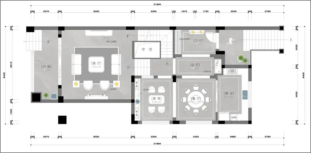 雖然有著540方的超大空間,但設計師依然謹慎地衡量著每一個家具、每一個飾品的尺寸大小和擺放位置,最后呈現的效果,無論是家具還是配飾,均以其優(yōu)雅的姿態(tài)、平和而富有內涵的氣韻,描繪出屋主樂觀平實的生活理念。