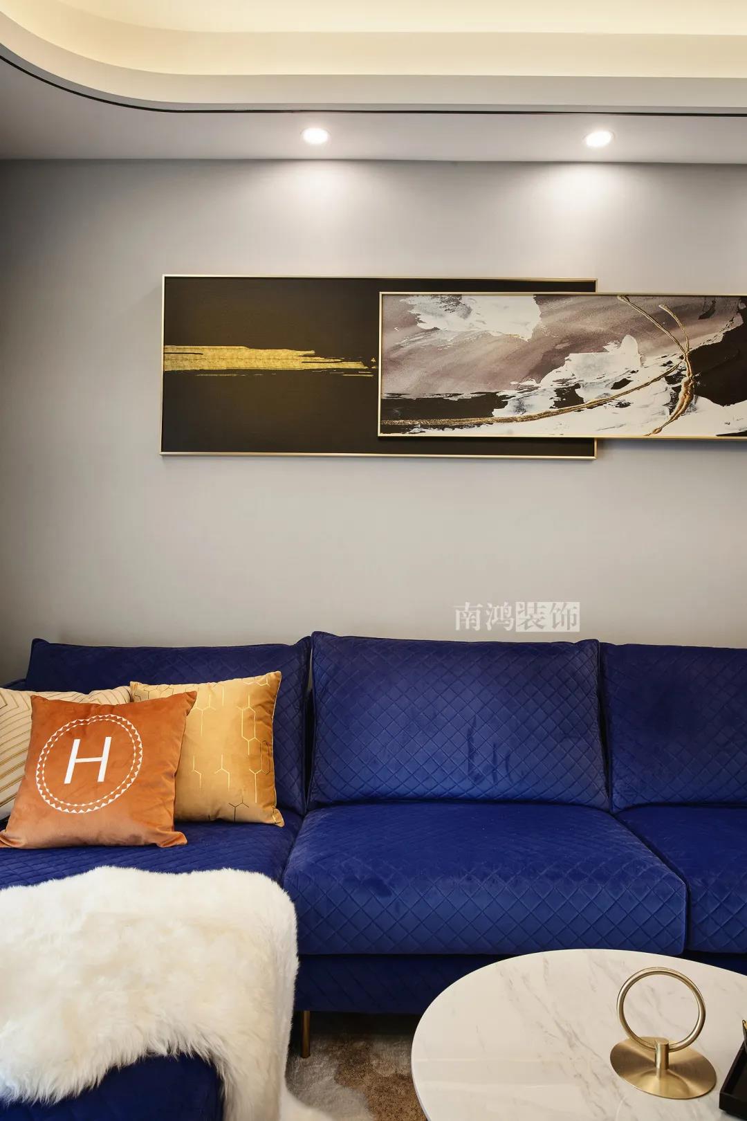 客廳以白灰為主基調(diào),寶藍(lán)色絨布主沙發(fā)搭配大理石茶幾,空間疏密有致,輕奢氛圍濃厚。