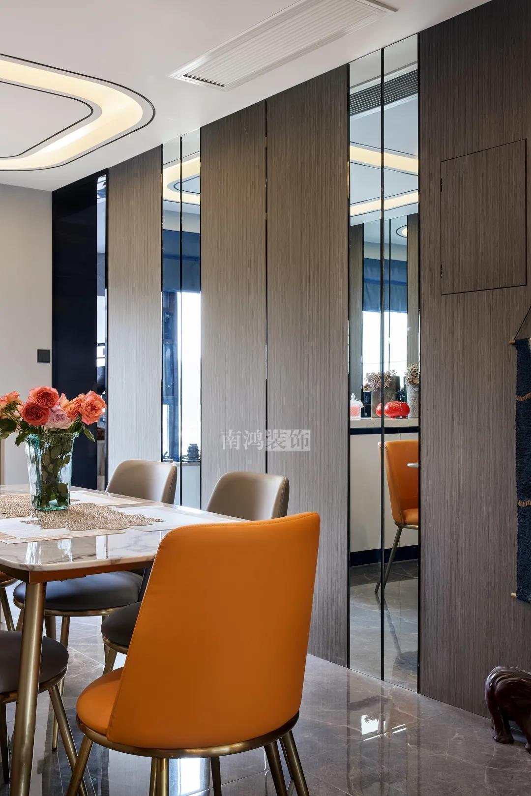 為放大空間感和彌補(bǔ)采光,餐廳一側(cè)采用鏡面裝飾,加上黑色金屬嵌條,玻璃與金屬的完美配合,帶出優(yōu)雅的格調(diào)。
