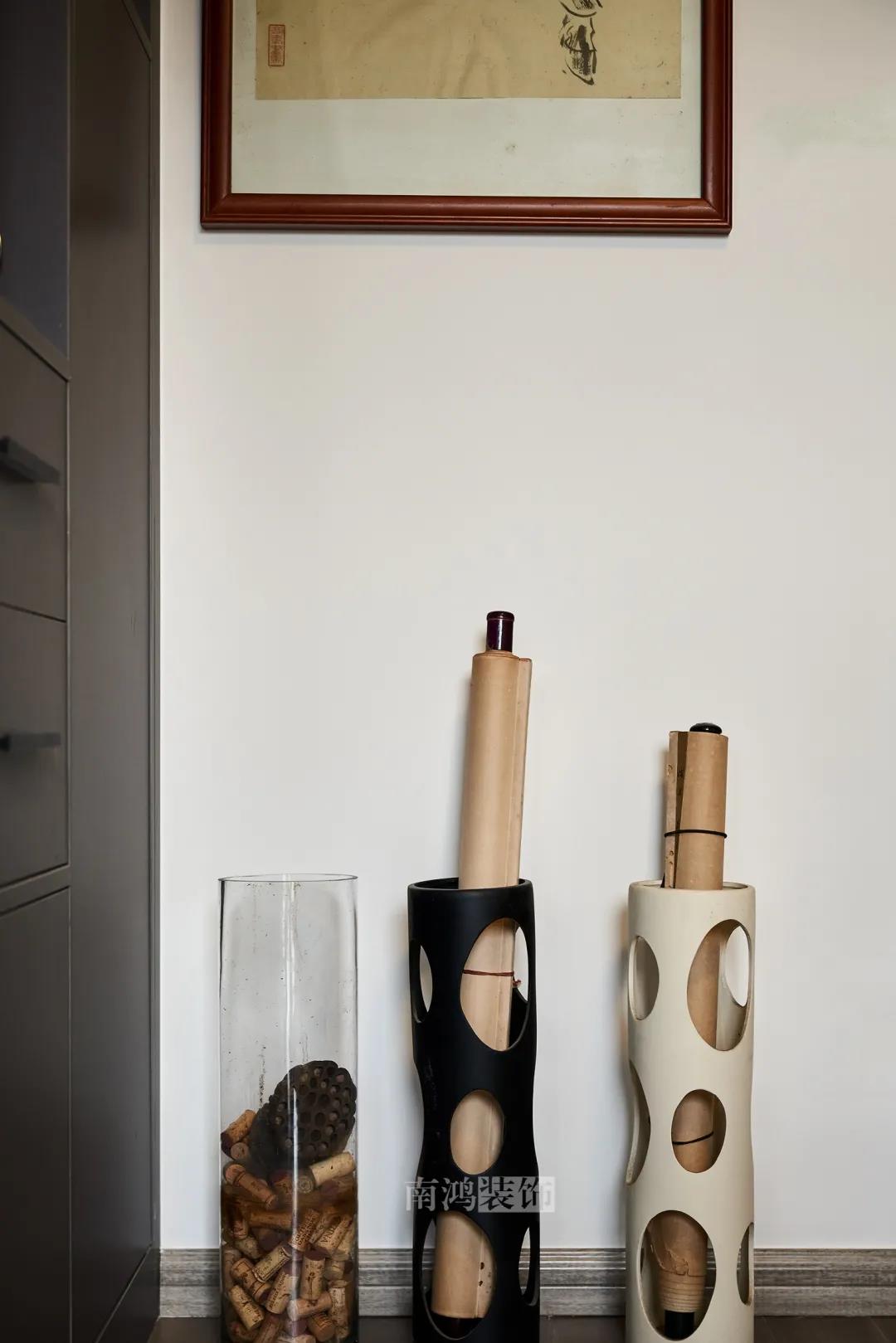 格調(diào)滿滿的書房空間,布置精簡(jiǎn)但非常有儀式感,一側(cè)是深色置物柜,提供充足的空間收納書籍與各種藝術(shù)擺件。