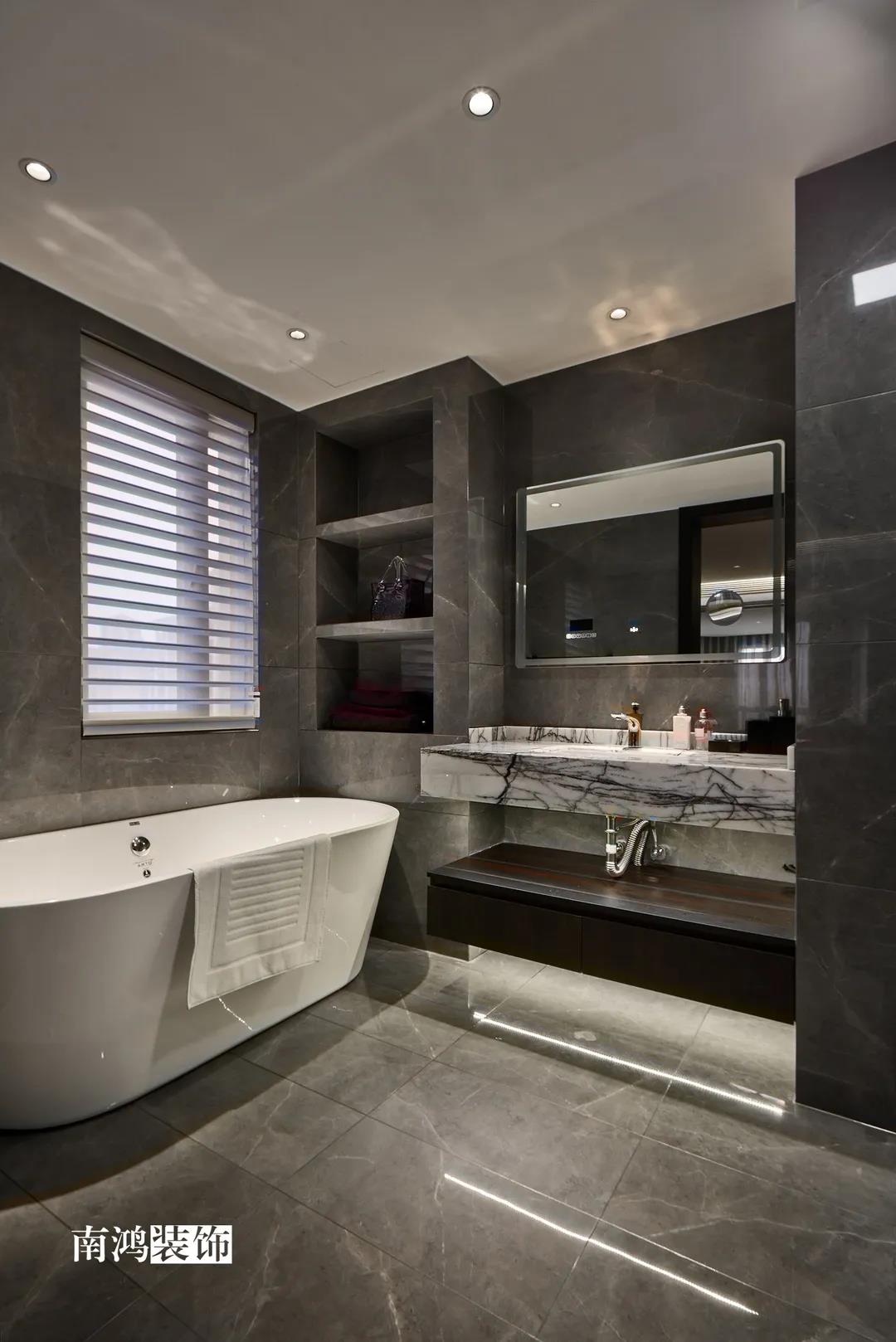 色彩上主要依照男主人的喜好,選擇了深色的石材與木飾面,點(diǎn)綴上深紅色的軟裝元素,整體搭配不會(huì)太過沉悶,再結(jié)合柔和的燈光用以打造空間氛圍感,完美詮釋“紅與黑”主題!
