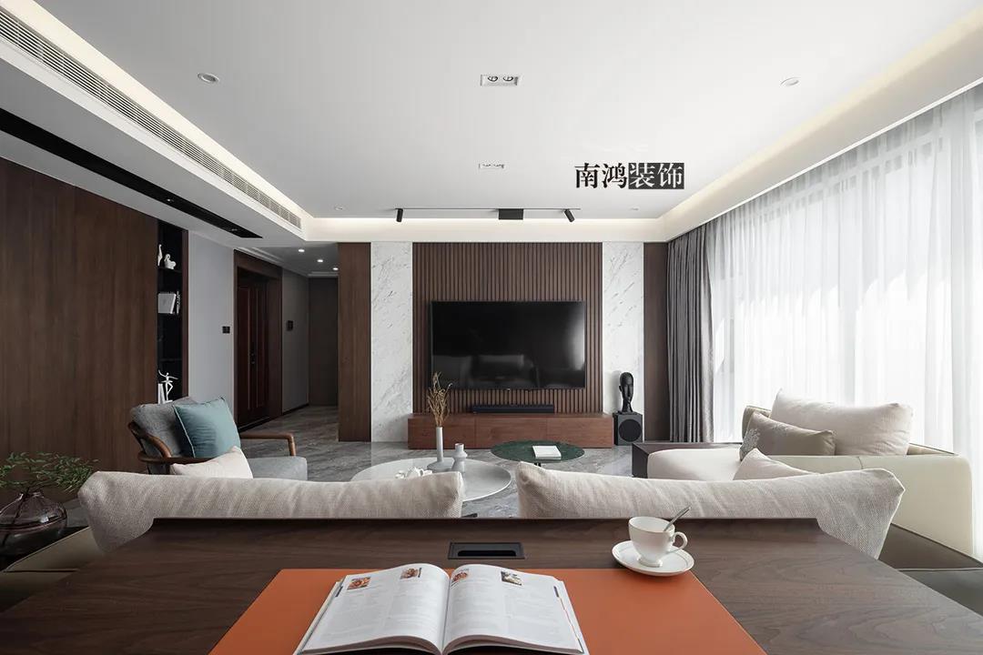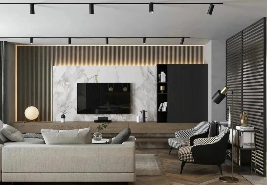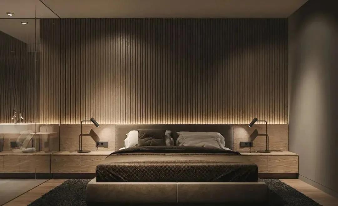 除隔斷之外,木格柵應(yīng)用于各空間的背景墻也是常見(jiàn)的做法,比如客廳、臥室等。